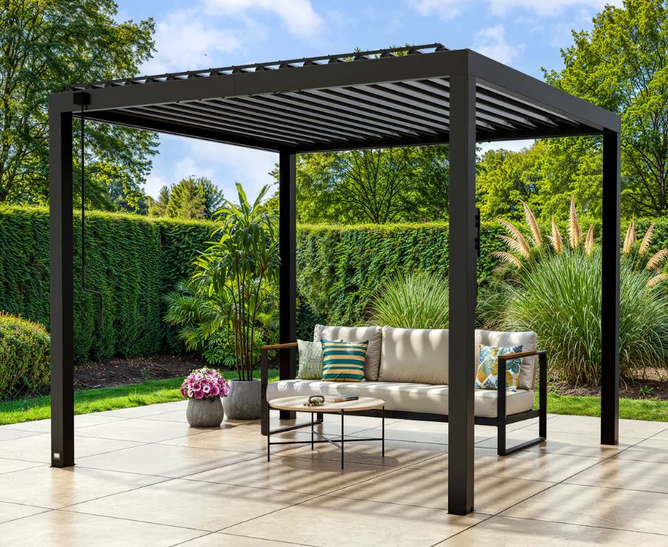 Modern styled steel pergola with louvers that open/close for your desired level of comfort, includes gutter drain, and powerstrip.