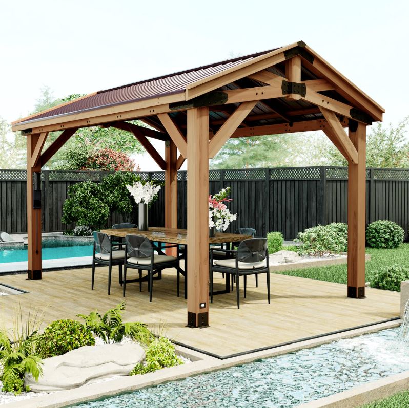 Traditional styled cedar wood gazeebo with gabled steel roof, and decorative elements, includes power strip.
