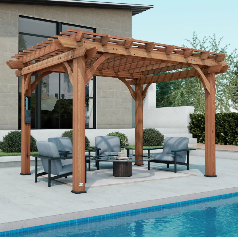 Traditional styled cedar wood pergola with traditional slats on the top with decorative elements, includes power strip.