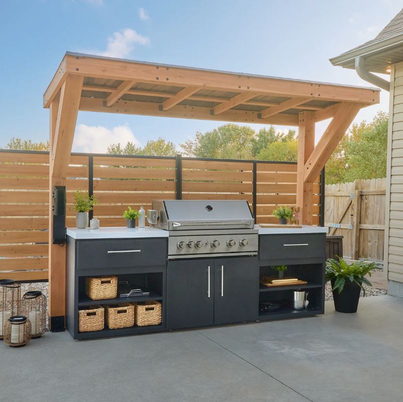 Modern styled steel kitchen cabinets, stainless steel grill and accessories, cantilevered cedar wood cover with steel roof.